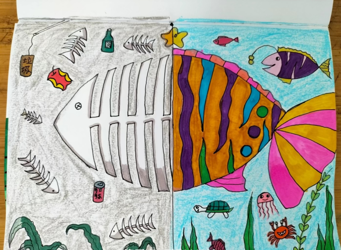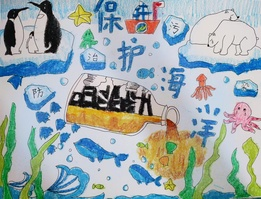 王鈺皓小朋友的作品直面海洋污染現(xiàn)象。作品中心的黑色污染觸目驚心。隨著海洋的開發(fā),污水廢水排放入海現(xiàn)象越來越嚴(yán)重,導(dǎo)致海洋生物生存環(huán)境惡化。作品里豐富多樣的海洋動物亟需保護(hù)。王鈺皓小朋友通過對比表達(dá),希望呼吁人們一起保護(hù)海洋。