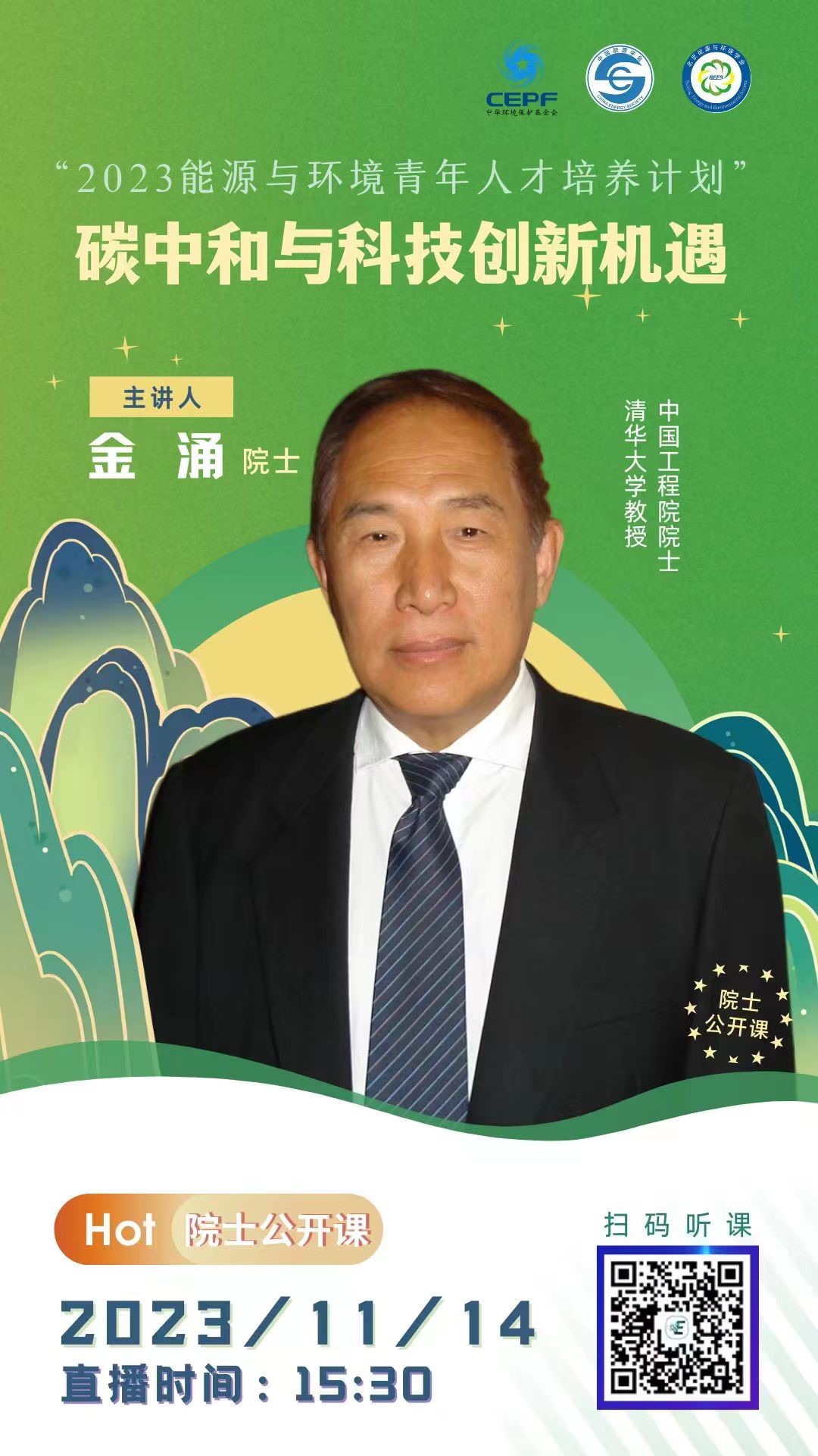 2023年,第二期培訓順利開展。本期院士公開課,我們很榮幸邀請到清華大學教授、中國工程院院士:金涌院士,為大家帶來“碳中和與科技創新機遇”專題講座。