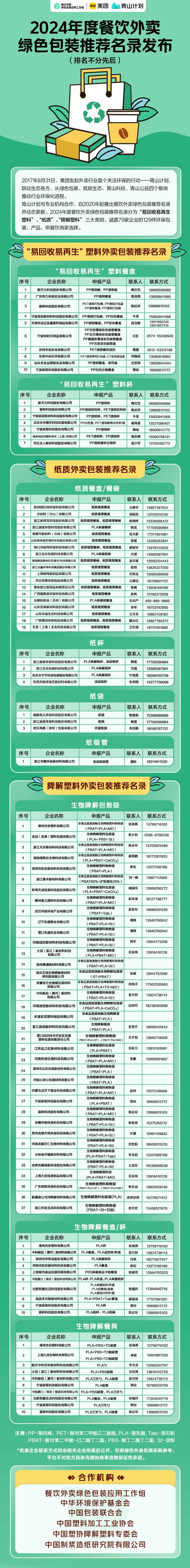 近日,在深圳舉行的2024年中國包裝容器展上,“2024年度餐飲外賣綠色包裝推薦名錄”正式發布。該名錄由美團“青山計劃”、餐飲外賣綠色包裝應用工作組發起,中華環境保護基金會美團外賣青山公益專項基金支持,經中國塑料加工工業協會、中國制漿造紙研究院有限公司、中國塑協降解塑料專委會征集和評審產生,納入79家優質餐飲外賣包裝企業的129件環保產品,涵蓋PLA、PBS餐盒,紙漿模塑餐盒、透明PP餐盒、紙袋、紙吸管等,供有需求的餐飲企業進行選擇。