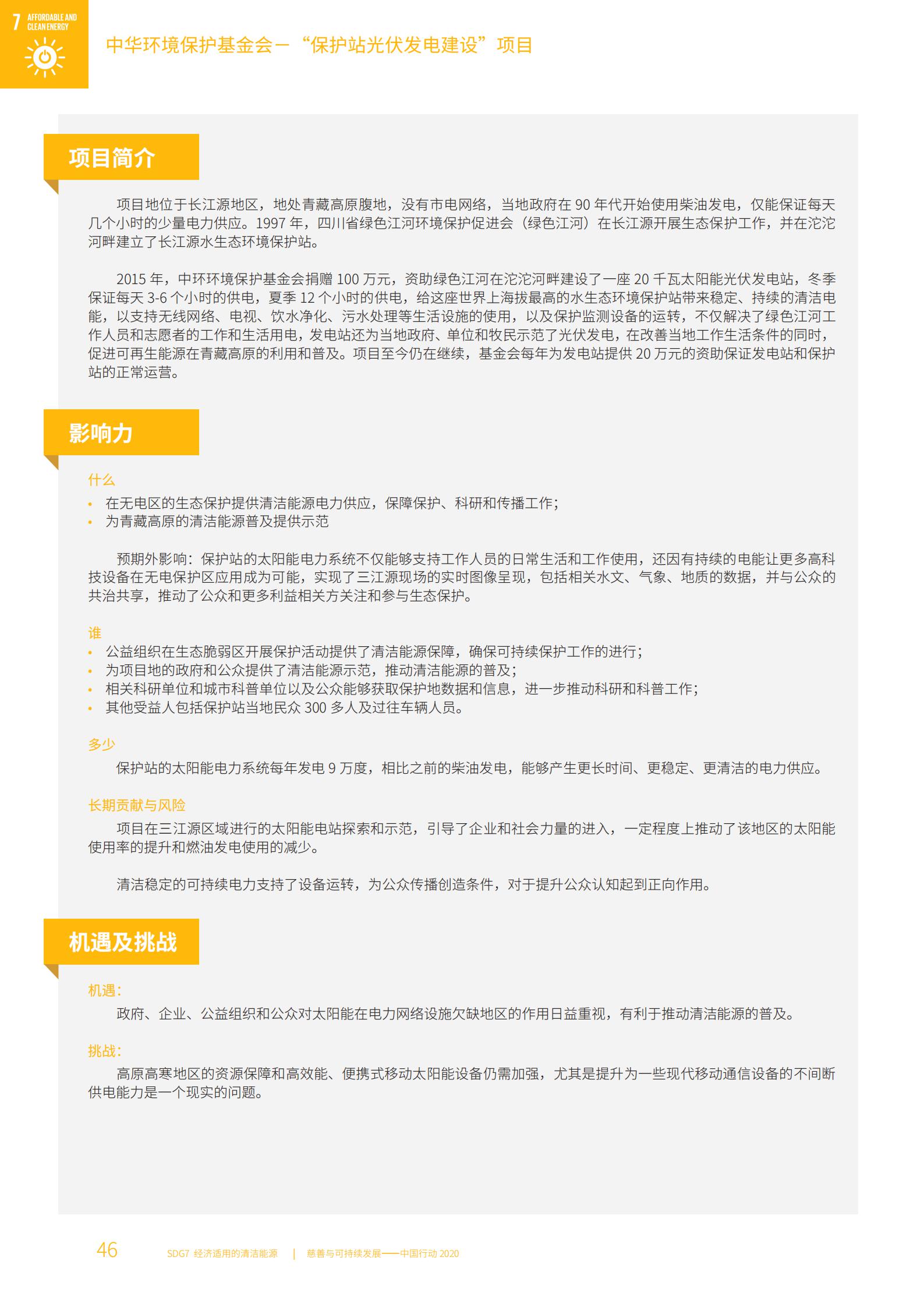 近日,我會“保護站光伏發電”項目入選《慈善與可持續發展——中國行動2020》報告,該報告由聯合國開發計劃署駐華代表處和基金會中心網聯合發起,總結了中國慈善領域對可持續發展目標的貢獻,形成了17個可持續發展目標典型案例。