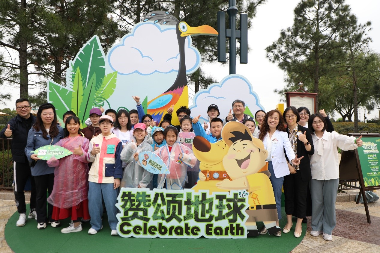 中華環境保護基金會副秘書長房志,中國福利會少年宮副主任鄭思晨,上海迪士尼度假區演職人員代表與學生們在“贊頌地球—環保市集”前合影