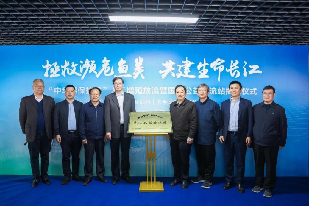 武漢市禁捕辦副主任、市農業農村局副局長王文高(左一)、中國水產科學院長江所副所長李創舉(左二)、武漢市生態環境局副局長張作波(左三)、中國國際航空股份有限公司湖北分公司黨委書記黃勤(左四)、中國水產科學研究院長江所研究員、院首席科學家危起偉(右一)、湖北省長江生態保護基金會執行理事長鄔劍剛(右二)、中華環境保護基金會理事長徐光(右三)、武漢市人民政府副秘書長陳明權(右四)共同為武漢公益放流站揭牌