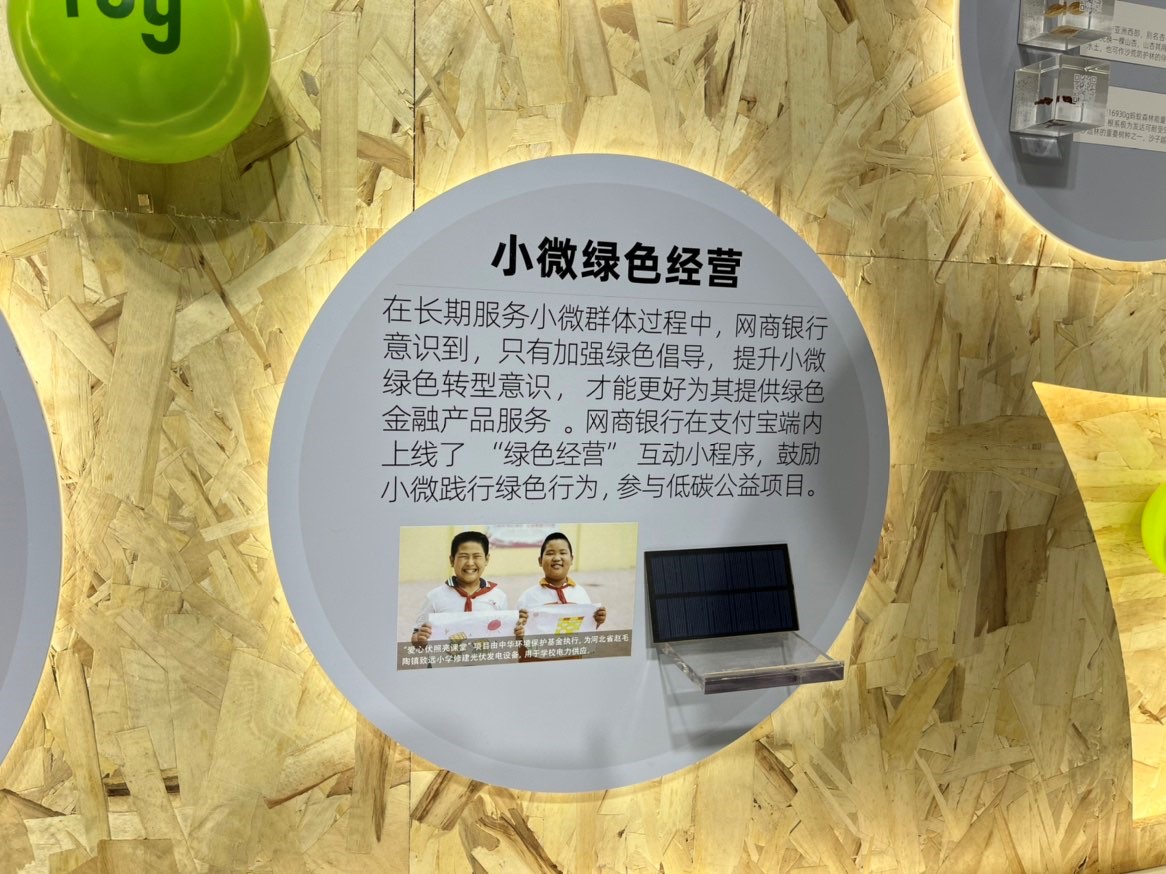 現場展出的光伏板實物模型板吸引了不少參觀者駐足,解說人員向大家介紹了低碳校園項目的背景。相比大中型企業,盡管小微群體在生產經營過程中具有污染排放量小、環境風險低等特征;但作為經濟的“毛細血管”,小微具有覆蓋區域廣,服務、就業人口多和環境效益積少成多的特征。小微群體積極參與低碳發展,對我國實現“雙碳”目標意義重大。然而,網商銀行在實地調研走訪和長期為小微商家服務過程中發現,相當一部分小微經營者當前對碳減排的認知還比較模糊。網商銀行是本次低碳公益項目的實際出資方,希望通過邀請小微群體參與到低碳公益項目捐贈中來,提升小微自身低碳轉型發展意識。只有讓他們切實地感知到低碳行為發生在生產經營活動的方方面面,才能更好地調動他們低碳轉型積極性并為他們提供綠色金融支持。