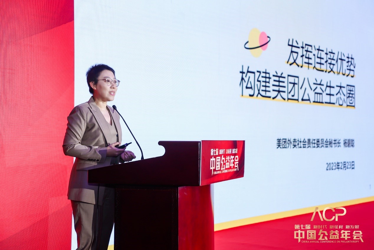 2月23日,第七屆中國公益年會在北京舉行。本屆年會以“新時代 新征程 新發展”為主題,從“教育公益”“互聯網公益”“醫療救助”“鄉村振興”“彩票公益”等五大板塊展開,全面回顧與總結了過去一年中國公益事業發展歷程,并對2023年公益事業發展趨勢進行了深入探討。中華環境保護基金會合作伙伴美團開展的“青山計劃”項目在第七屆中國公益年會上獲得了“年度公益項目”的榮譽。美團外賣社會責任委員會秘書長楊碧聰在會上做了題為“發揮連接優勢 構建美團公益生態圈”的主旨演講。