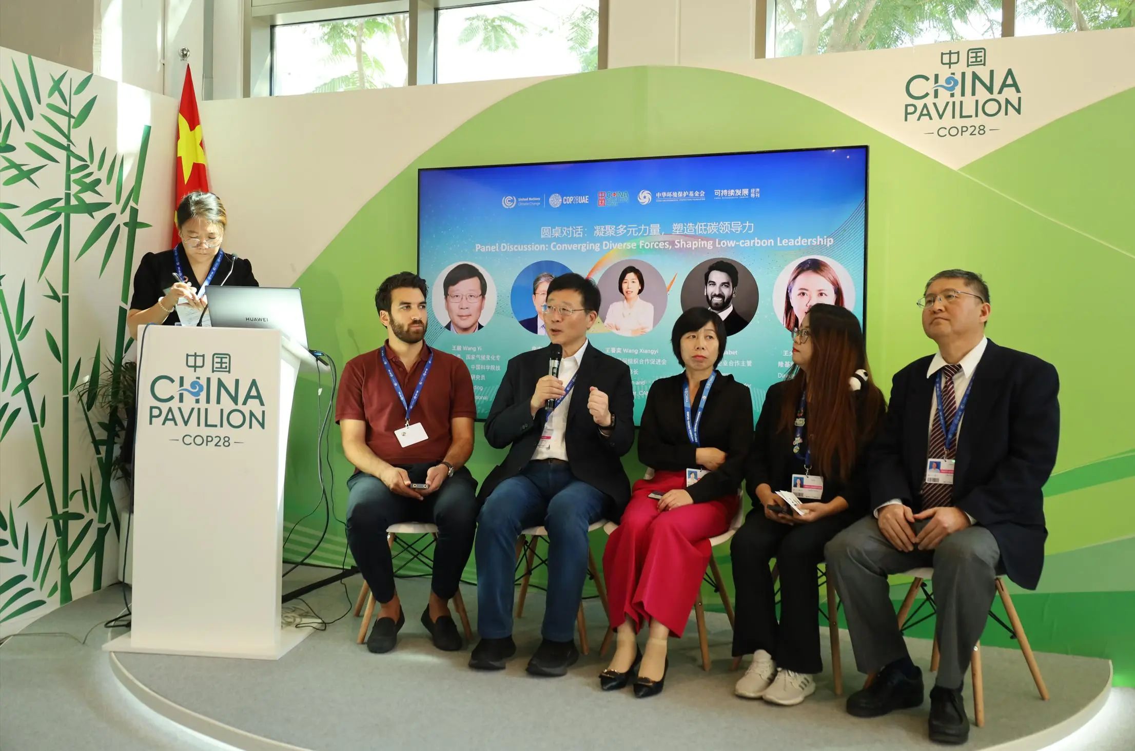 圓桌對(duì)話環(huán)節(jié)(左2全國(guó)人大常委會(huì)/人大常委會(huì)委員 國(guó)家氣候變化專家委員會(huì)副主任 中國(guó)科學(xué)院技術(shù)戰(zhàn)略咨詢研究院研究員王毅、左3中國(guó)國(guó)際民間組織合作促進(jìn)會(huì)副理事長(zhǎng)兼秘書長(zhǎng)王香奕、右2隆基綠能品牌公關(guān)總監(jiān)王火火、右1中華環(huán)境保護(hù)基金會(huì)副秘書長(zhǎng)房志、左1Business for Nature企業(yè)合作主管John Sabet)